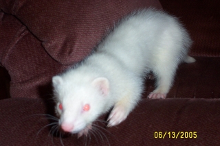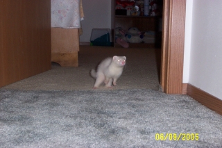 as soon as she is turned loose in her new home. She is amazingly agile and quick on her feet. She picked up on her new surroundings in record time. She defintely has a personality of her own! She really seems to have a combination of traits from every ferret we have ever had. |